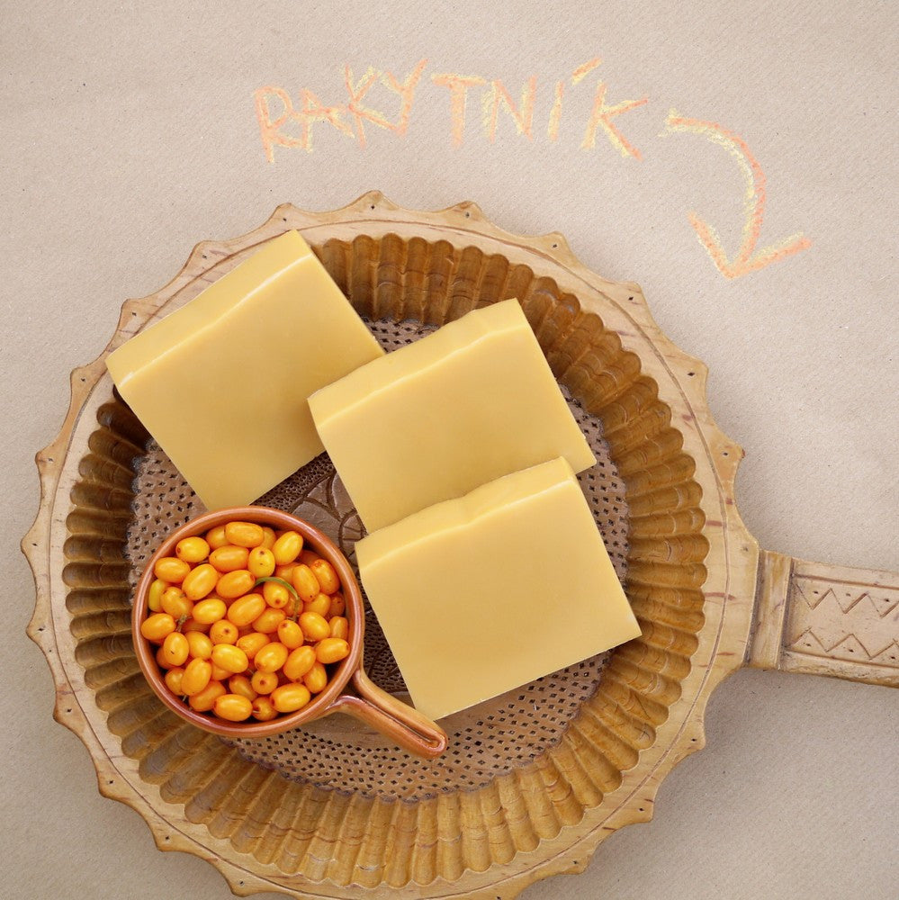 Kľúčovou zložkou rakytníkového jemného mydla je rakytníkový olej, získaný šetrnou a ekologickou CO2 extrakciou z organického rakytníka. Takýto olej je špecifický svojím zložením, obsahuje veľké množstvo kyseliny palmitoolejovej - nazývanej aj omega-7. Palmitoolejová kyselina pokožku ošetruje, napomáha regenerácii pokožky, ochrane membrán a zabraňuje oxidácii (starnutiu pokožky). Rakytník okrem omega-7 obsahuje tiež ďalšie cenné regeneračné a ošetrujúce zložky - omega 3,6,9, steroly, tokoferoly a karotenoidy...